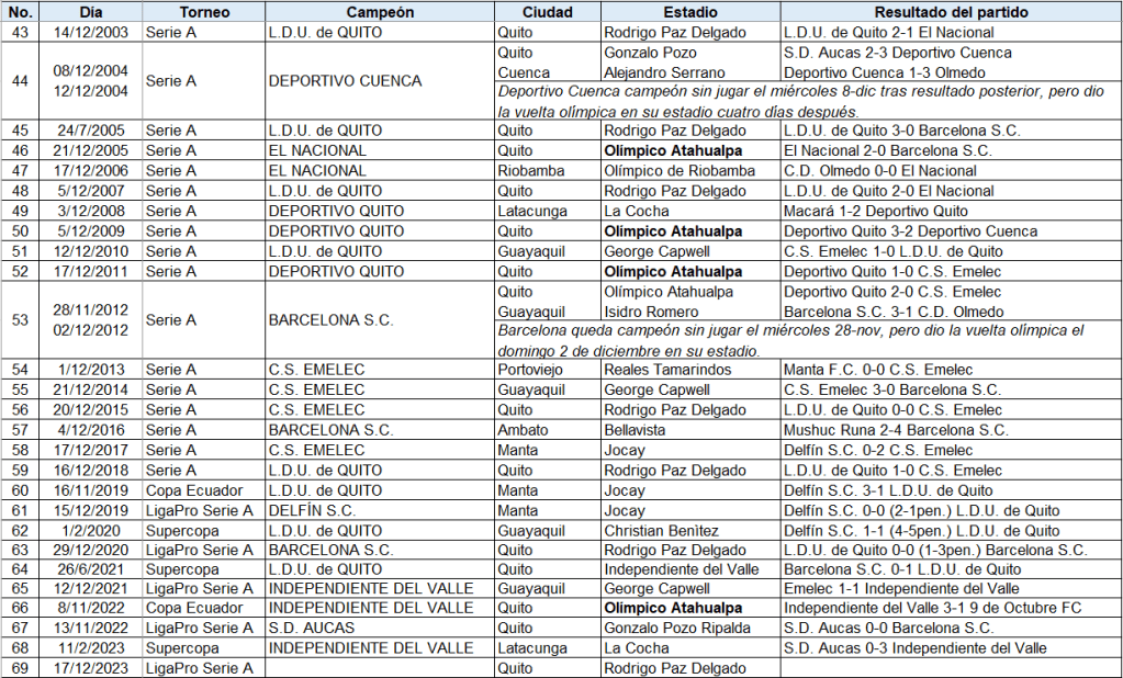 En resumen, de las 70 definiciones previas de Campeón en el fútbol profesional de Ecuador (65 en Serie A, dos en Copa Ecuador y tres en Supercopa Ecuador); 67 vueltas olímpicas, pero solo en 64 el Campeón la dio al terminar su propio partido, las excepciones en: 2000, 2004 y 2012 (vuelta olímpica posterior) y en 1962, 1971 y 1973 se dieron particularidades que no permitieron la vuelta en cancha.