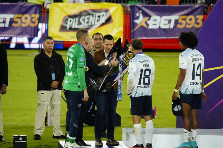 No solo fue espectador, también tuvo la oportunidad de entregar el trofeo de campeón a Liga Deportiva Universitaria de Quito.