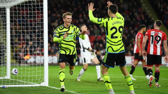 Arsenal tuvo un arranque de partido soñado en su visita al Sheffield United y a los 39 minutos del primer tiempo ya ganaba 5-0 en la fecha 27 de la Premier League. Odegaard, Bogle en contra, Gabriel Martinelli, Kai Havertz y Declan Rice marcaron los goles. En el complemento, Ben White estableció el 6-0 definitivo.