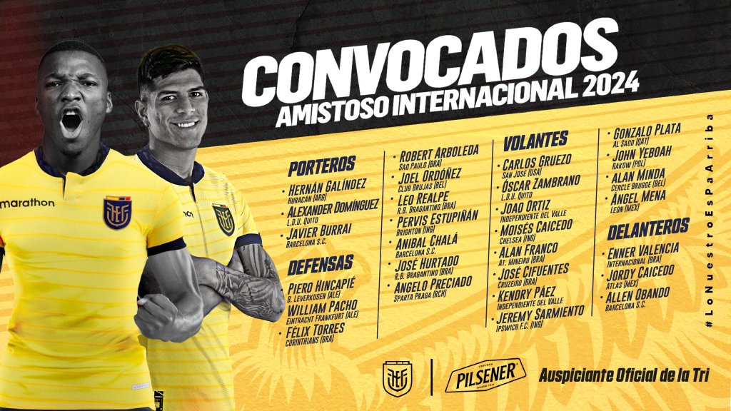 Además, Gonzalo Plata, Jeremy Sarmiento y Joel Ordóñez regresan a una citación del Equipo de Todos, de cara a los encuentros que se jugarán los días jueves 21 y domingo 24 del mes señalado.