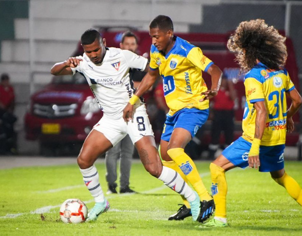 El cotejo arrancó con el elenco local defendiendo de forma ordenada, se plantó firme y no mostró fisuras en sus líneas. La visita pretendió tomar las riendas del compromiso y Ezequiel Piovi se metió entre los centrales para dar salida. Los “bananeros” propusieron un partido muy físico y con constantes faltas para cortar la dinámica. En contraste, LDU se aproximó, acumuló tiros de esquina y su principal problema fue caer en el fuera de juego.