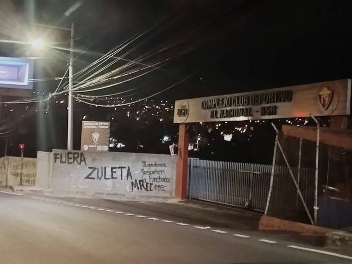 Por la noche de este miércoles, una barra organizada que se identifica con El Nacional llegó al complejo de Tumbaco y a través de pancartas y, hasta con actos vandálicos como pintar paredes, exigió la salida de Marcelo Zuleta para que otro entrenador llegue al timón nacionalista.