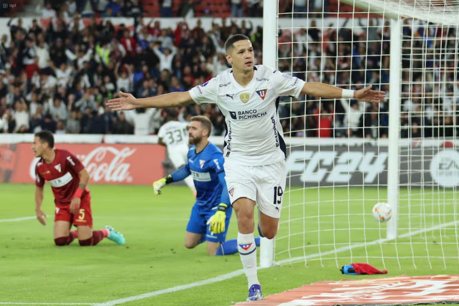 En la rueda de prensa de los albos este día, el goleador de Liga Deportiva Universitaria de Quito, Álex Arce, atendió a los medios de información.
