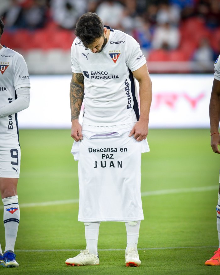 El zaguero uruguayo de LDU, Gian Franco Allala, saltó a la cancha con una camiseta en homenaje a Juan Izquierdo, su compatriota y jugador de Nacional uruguayo que falleció el martes en Brasil.