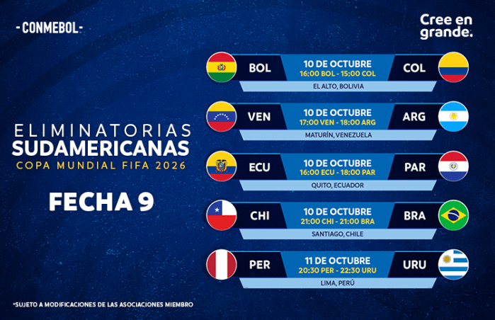 El jueves 10 y viernes 11 de octubre se jugarán los partidos correspondientes a la fecha 9 por las Eliminatorias Sudamericanas para la Copa Mundial 2026. Argentina es líder de la tabla de posiciones luego de la disputa de ocho jornadas.