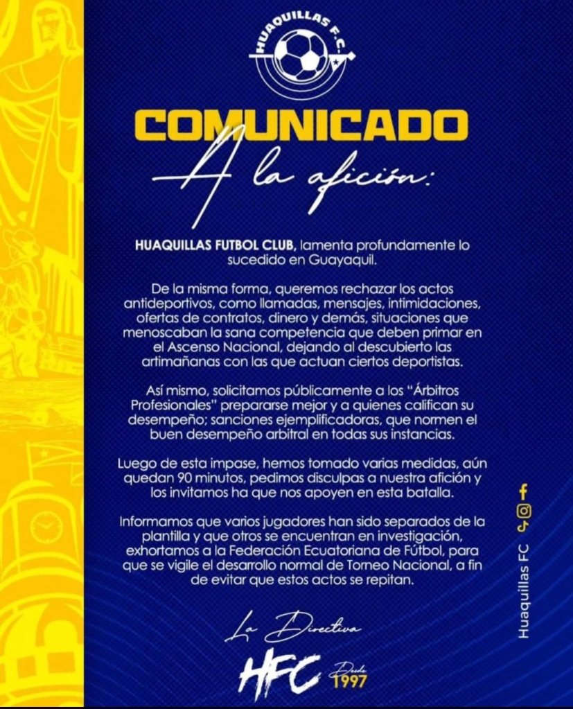Horas antes, el Huaquillas Fútbol Club escandalizó al fútbol profesional de la Mitad del Mundo al compartir un comunicado en el que denunciaron llamadas misteriosas ofreciendo sobornos y contratos a sus jugadores, previo al partido en el que resultaron goleados 5 a 1 a manos del Naranja Mekánica, confirmando que luego del mismo separaron a varios de sus futbolistas.
