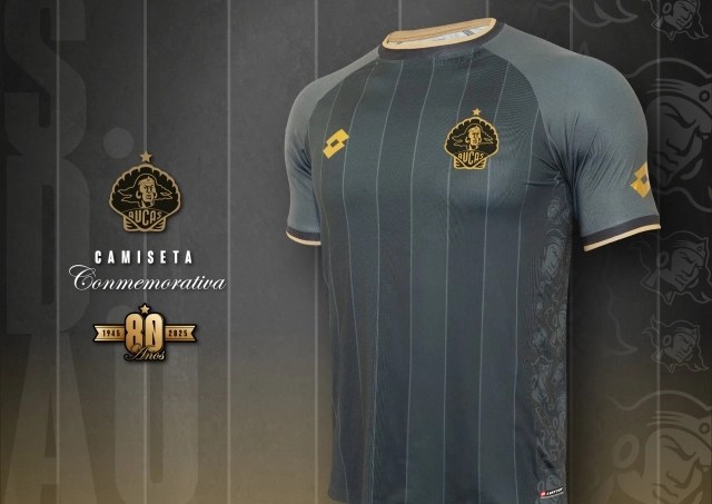 Aucas presentó una camiseta conmemorativa por sus 80 años de historia. Lotto ha traído a la vida, una armadura gris a franjas entre tonos claros y oscuros. Para la zona de los sponsors, cuellos y mangas se ha usado el dorado para dar contraste.