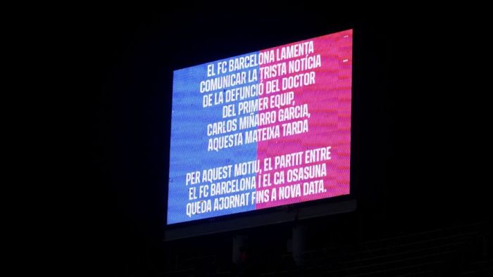 El encuentro de la liga española entre el FC Barcelona y Osasuna, que debía disputarse este sábado en el Estadio Olímpico Lluís Companys, fue suspendido por el fallecimiento del médico del equipo azulgrana Carles Miñarro, según informó el club catalán.