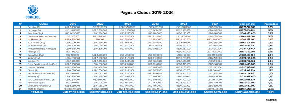 Por medio de sus medios oficiales, la Conmebol reveló que durante el periodo de 2019 a 2024, entregó un gran total de USD 1.469 millones a los clubes por concepto de premios correspondientes a su competición tanto en la Copa Libertadores como en la Copa Sudamericana, siendo Palmeiras de Brasil el que comanda con USD 77.7 millones ganados en el Top 21 que incluye a tres clubes de Ecuador.