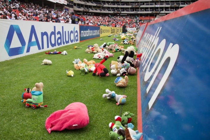 Los hinchas de Liga de Quito empiezan a convertir en tradición un noble gesto con los niños más necesitados en el marco del Día del Niño, que se celebra mañana, 1 de junio. Ayer, sábado, durante el partido entre Liga de Quito y Técnico Universitario, los aficionados albos llevaron voluntariamente peluches al estadio para arrojarlos al campo de juego.