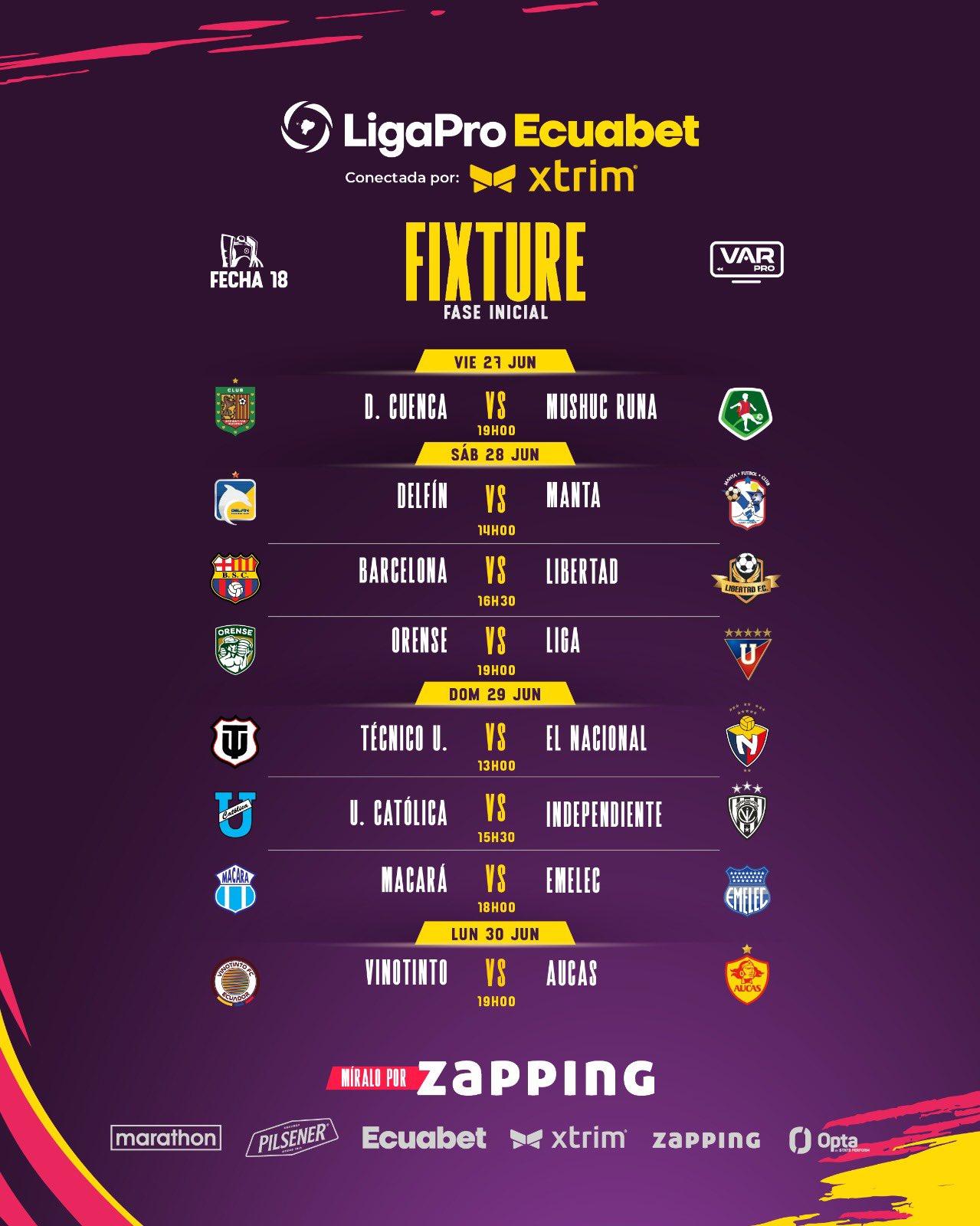 Fecha 18 en la Fase Inicial, el líder Independiente del Valle tendrá una salida complicada al enfrentar a Universidad Católica, aunque jugará con resultados conocidos, ya que previamente Barcelona recibe a Libertad y LDU visitará a Orense.