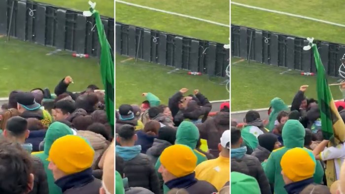 En la escena que se hizo viral en las redes sociales se puede observar a algunas personas identificadas con los colores de Aldosivi peleándose a cuchillazos. Además, se ve a un hombre con el rostro ensangrentado y otros intentando separar en medio del tumulto.
