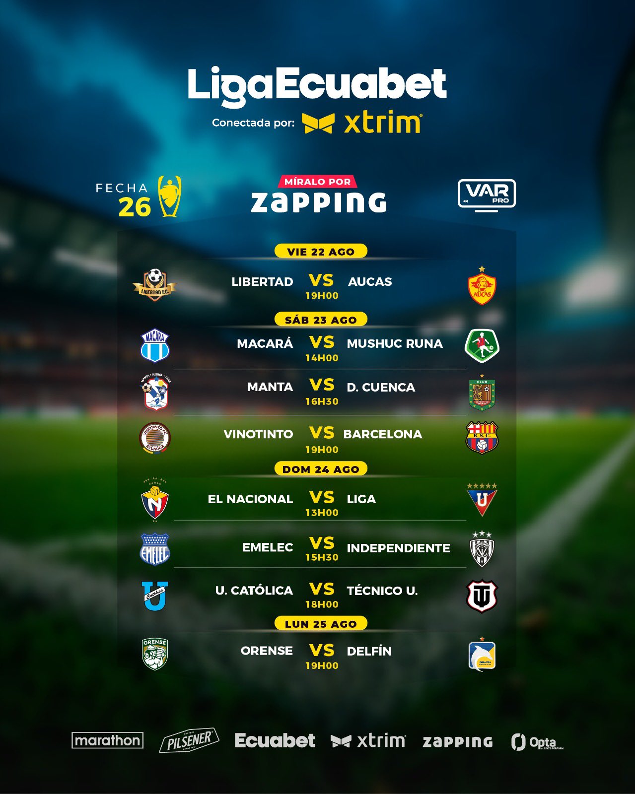 Fecha 26 en la Fase Inicial, Independiente del Valle visitará a Emelec, rival que no lo logra derrotar en el Capwell en las últimas ocho visitas, el escolta Liga de Quito tendrá el Derby ante El Nacional y el tercero, Barcelona visita a Vinotinto.