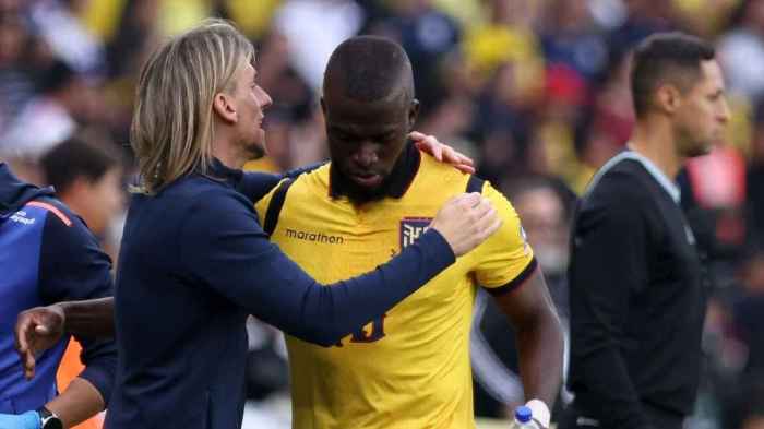 El rosarino conversó en conferencia de prensa y valoró el papel de su máximo referente en ataque, Enner Valencia: «El camino hasta acá nos dejó una información muy precisa y certera, pero con ganas de seguir mejorando. Nosotros desde que llegamos tenemos al goleador de las Eliminatorias, Enner hizo seis goles. No sé dónde surge esa preocupación, entiendo que si no está Enner no tenemos un promedio muy alto de jugadores como en defensa».
