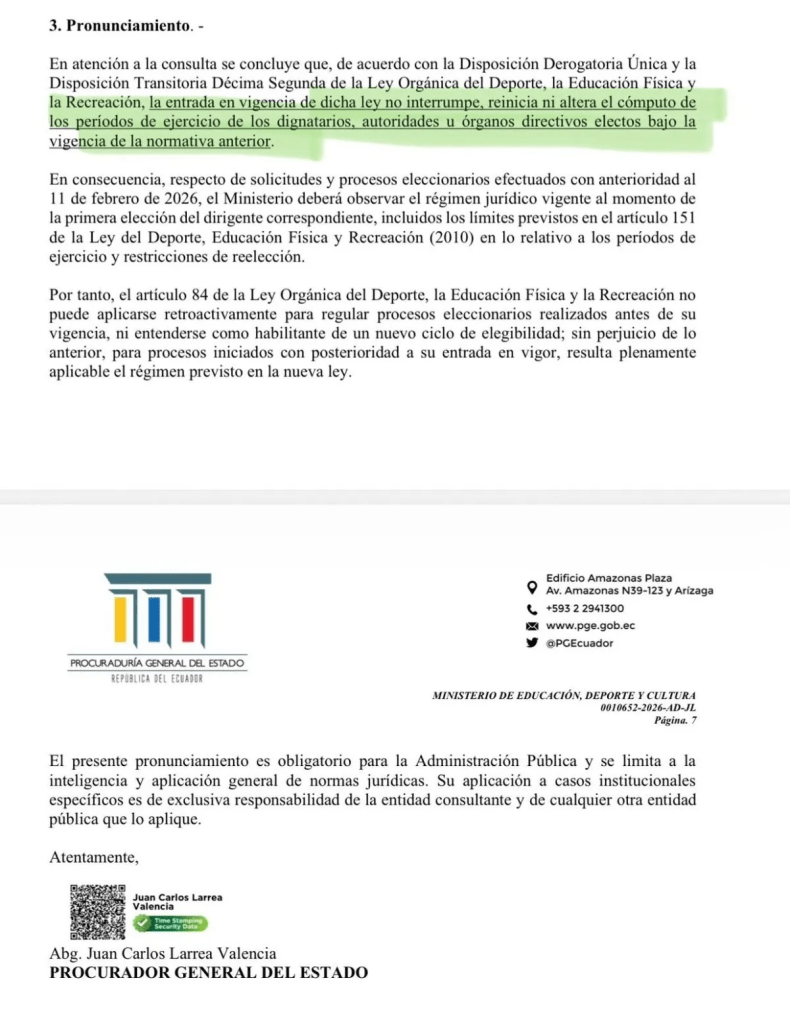 En el documento, la Procuraduría señaló que la vigencia de la nueva Ley Orgánica del Deporte, inscrita el pasado 11 de febrero, “no interrumpe, reinicia ni altera” los períodos dirigenciales que se encontraban en curso bajo la normativa anterior.