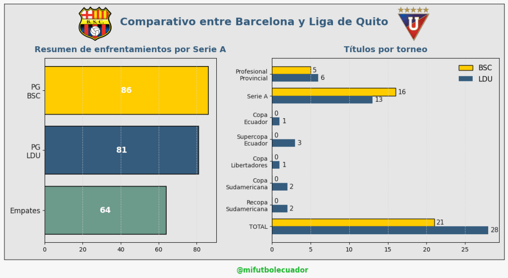 - Jugando en Quito se tienen 115 partidos, con 68 victorias de Liga, 35 empates y 12 victorias de Barcelona; la penúltima el 9 de marzo de 1996 por 0-1con gol de Luis Gómez en el estadio Atahualpa y la última, el 15 de abril de 2023, con el mismo marcador y autogol de José Enrique Ángulo.