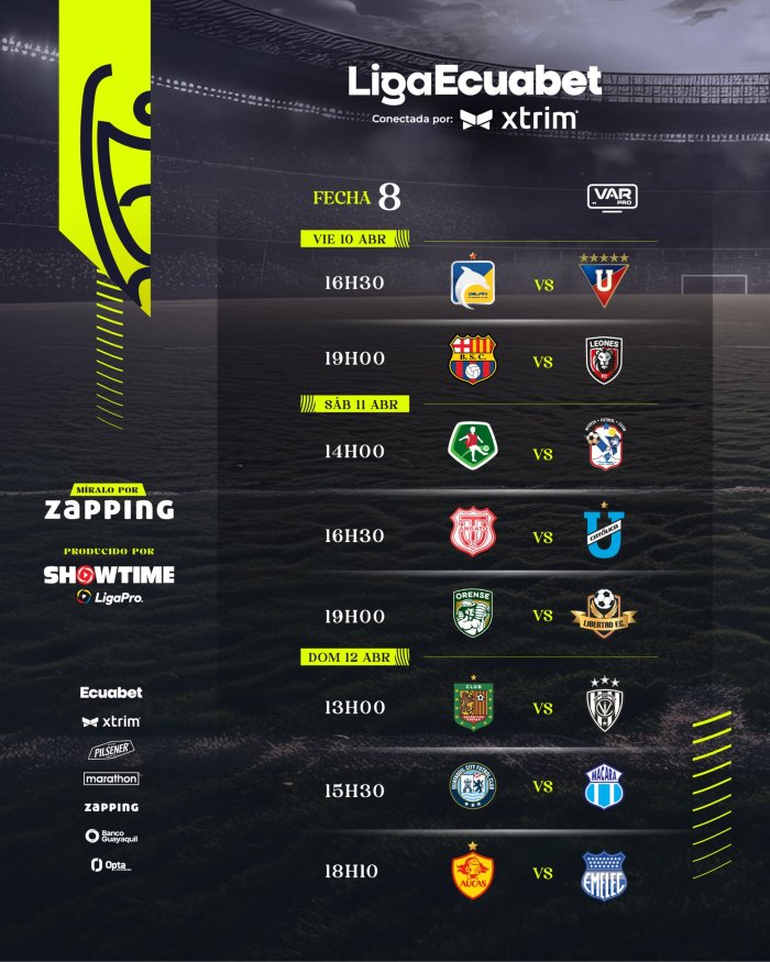 Octava fecha en Liga Ecuabet, nuevamente abren la fecha los coperos, Barcelona y Liga de Quito enfrentando a Leones FC y Delfín SC; recién el domingo actuará el líder Independiente del Valle visitando al Deportivo Cuenca.
